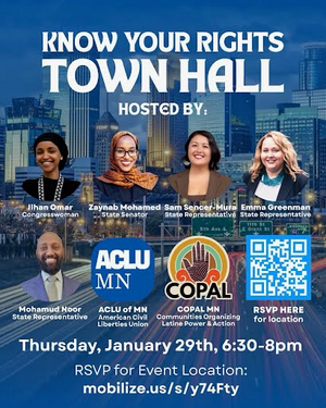 - Know Your Rights Town Hall with Rep. Ilhan Omar and many others, 6:30pm • Join Representative Ilhan Omar, State Senator Zaynab Mohamed, State Representative Sam Sencer-Mura, Emma Greenman and Mohamud Noor, and representatives from the ACLU-MN and COPAL to talk about your rights in response to ICE’s presence in Minnesota. Registration is required, and capacity is limited: more info and registration.