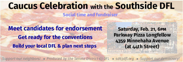 Please join us to celebrate our awesome caucuses. Enjoy solidarity and conviviality with other DFLers, and hear from the candidates who will seek endorsement at conventions over the next few months. And tell your party leaders about everything that needs to be fixed before the next caucuses (we have already heard about the wifi!).